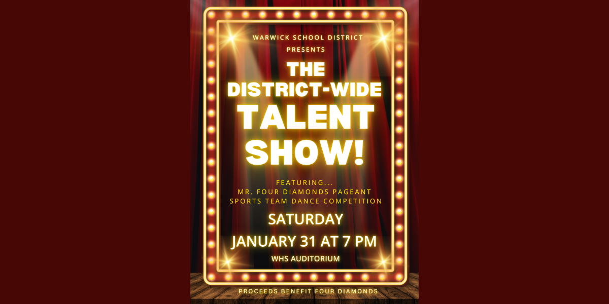 Warwick School District is looking to host its annual district-wide talent show on Saturday, January 31st at 7:00 PM. The event is sponsored by the UNITE Club (Advisors: Mrs. Lauren Graybill, Mrs. Tish Jones, Mr. Ken Bolland, and Mrs. Julie Mowrer) and will be held at Warwick High School.