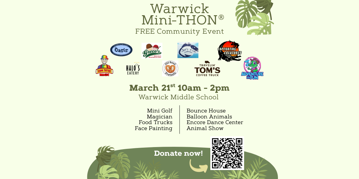 Warwick School District invites our community to join us on Saturday, March 21, 2026, from 10:00 am to 2:00 pm for our annual Community MiniTHON Event. Proceeds from the event will be donated to the Four Diamonds Fund, supporting efforts to fight pediatric cancer.